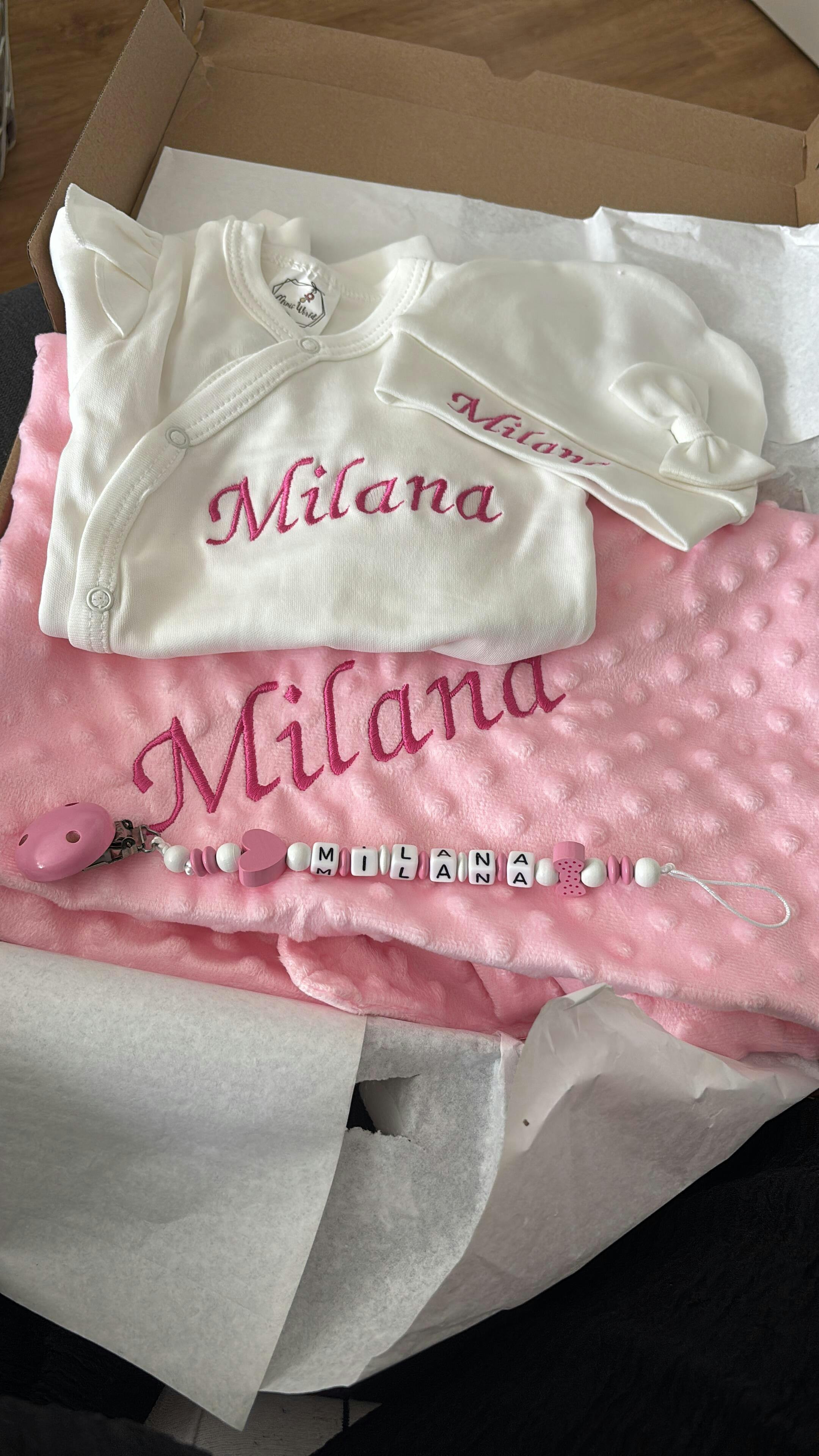 Einzigartige baby Erstlings-Set bestehend aus Plüschdecke 80 x 100 cm, Material 100% Polyester, geeignet rund um das Jahr. Strampler Set besteht aus Mütze und Fäustlinge, Größe 56 und Material 100% Baumwolle. Schnullerkette entspricht den DIN-Normen. Doppelnamen werden kleiner bestickt, bei Strampler ggf. übereinander.